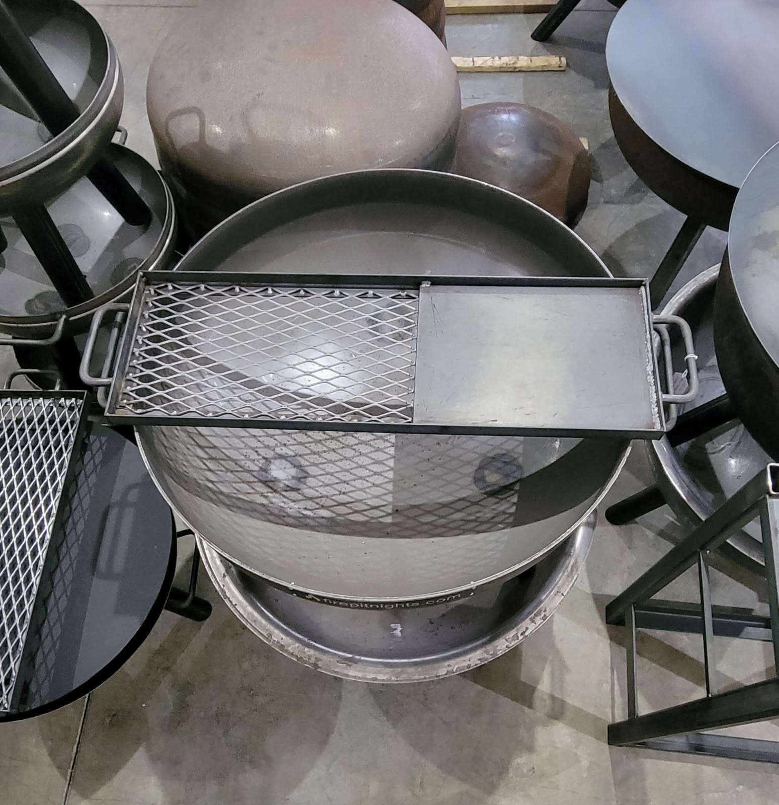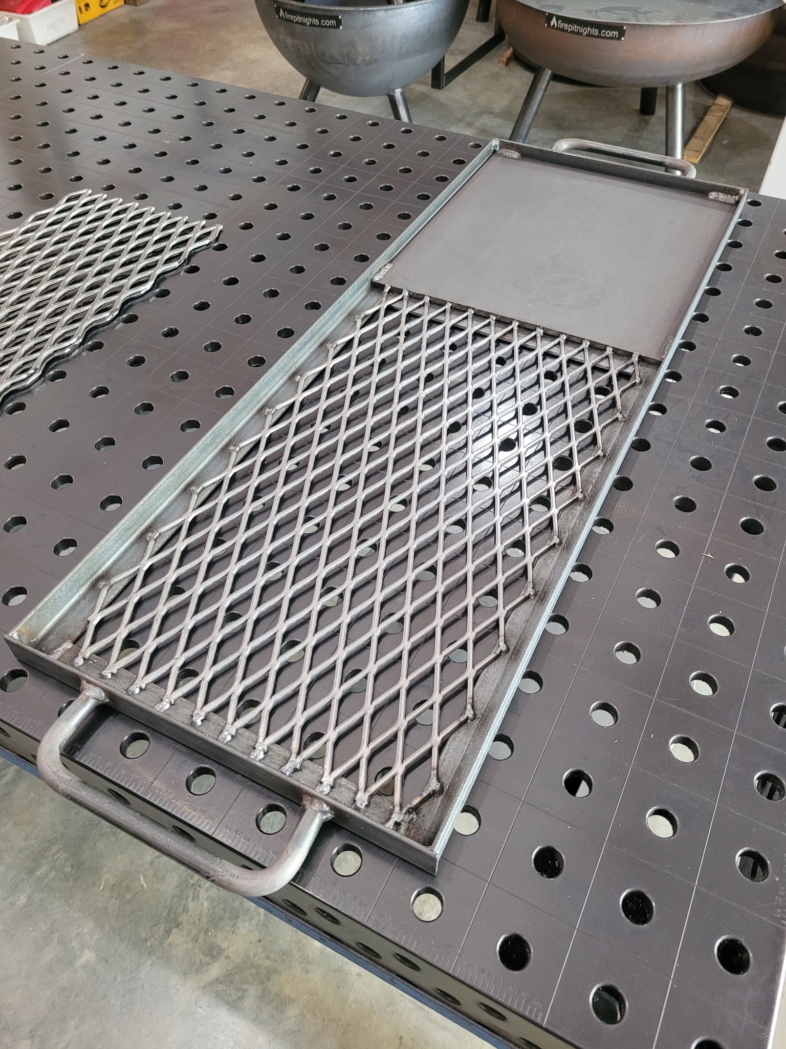 This grate is constructed from locally sourced steel and custom made to fit atop our firepits. The rectangle shape allows for room to manage the fire below as well as provide space around the perimeter of the firepit to move your meat and veggies away from direct heat as needed to finish all at once and make you look like a pro.